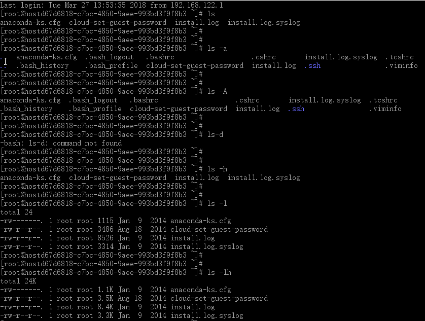 ls -l :列出文件并显示文件的属性和权限等信息,在上图已经看到了,会显示文件的属性和权限等信息,通常和其他参数一起使用,比如ls -ld 、ls -lh
