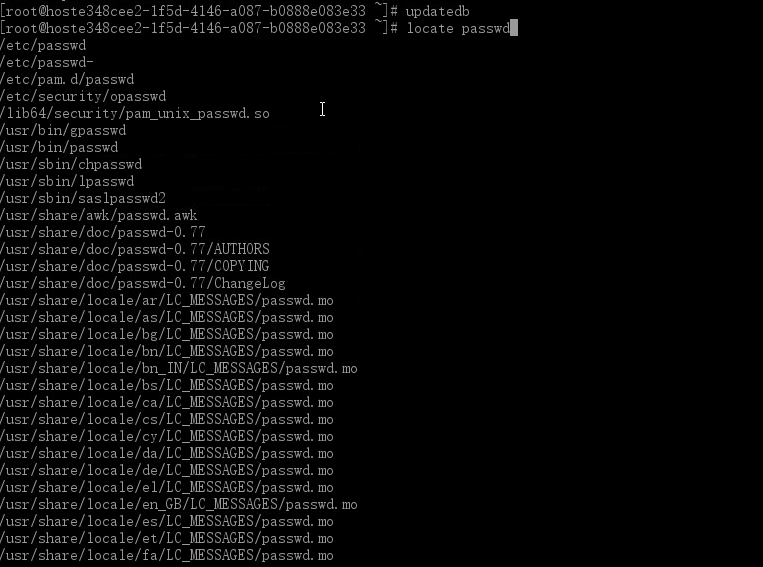 搜索所有有关passwd的档案,出错了。为什么呢?按照提示,说没有数据库,刚刚我们说locate是基于数据库的,没有数据库怎么行呢?我们执行updatedb 修复一下,再次搜索: