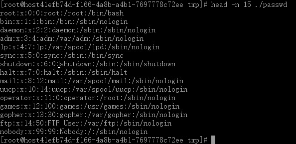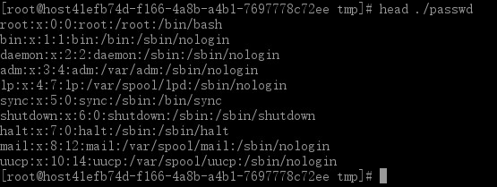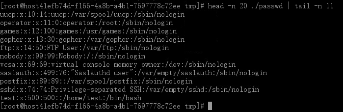 想一想,如果我要选取/tmp/passwd 文件的第10到20行的内容该怎么办呢?我们可以这样做,先选取头20行,然后再取后11行不就行了。那怎么做呢。这里我们就要用到管道命令了。先用 head 选取前20行,然后把输出结果交给tail命令选取后11行内容就行了。