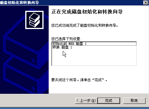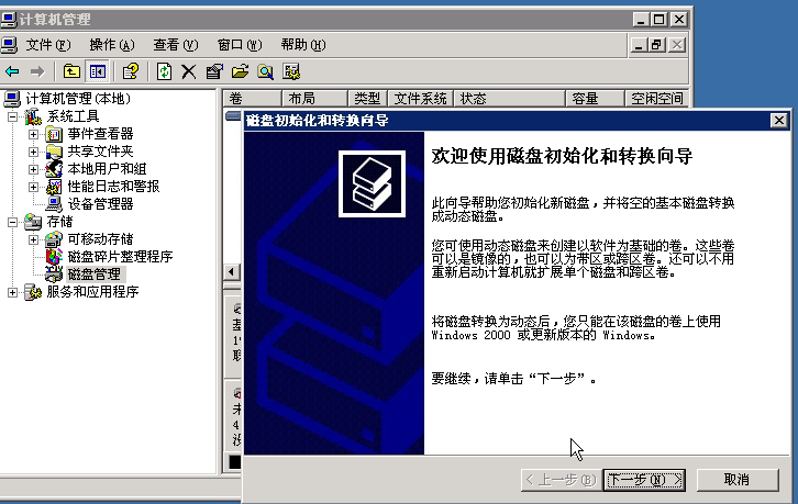 点击磁盘管理,会出现磁盘初始化和转换向导,利用向导添加一块新的磁盘,如下图: