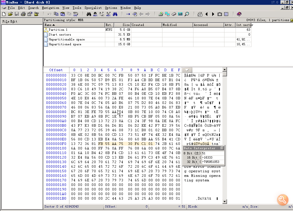 找到第一扇区末尾:000001F0处,查看末尾标志是否为55AA。