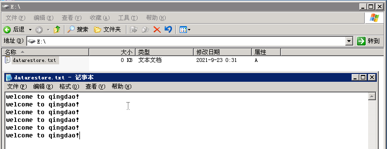 关闭winhex,打开E盘(新建立的分区),建立一个文本文件,命名为:datarestore.txt,并添加内容。