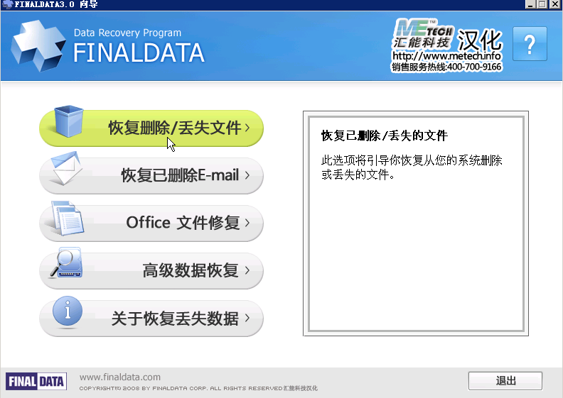 FinalData具有强大的数据恢复功能当文件被误删除(并从回收站中清除)、FAT表或者磁盘根区被病毒侵蚀造成文件信息全部丢失、物理故障造成FAT表或者磁盘根区不可读,以及磁盘格式化造成的全部文件信息丢失之后,FinalData都能够通过直接扫描目标磁盘抽取并恢复出文件信息(包括文件名、文件类型、原始位置、创建日期、删除日期、文件长度等),用户可以根据这些信息方便地查找和恢复自己需要的文件。甚至在数据文件已经被部分覆盖以后,专业版FinalData也可以将剩余部分文件恢复出来。