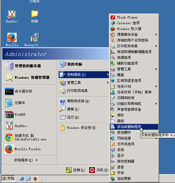 依次点击:“开始”->>“控制面板”->>“添加或删除程序”,以打开添加或删除程序对话框: