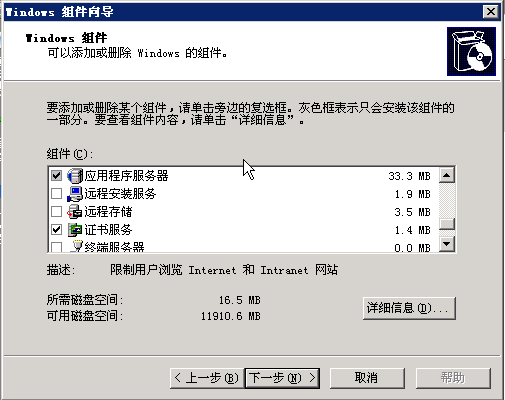 依次点击:“添加删除windows组件”,在组件向导中选中“应用程序服务器”与“证书服务”,先不要点击下一步: