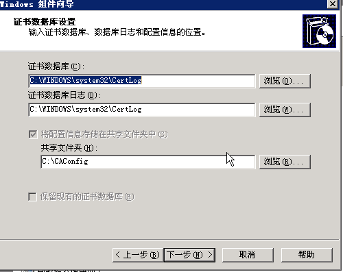 下一步后,会出现证书数据库的相关设置,不用修改,继续下一步: