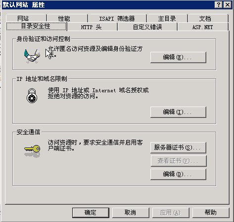 打开默认网站属性,选择“目录安全性”标签,单击“编辑”