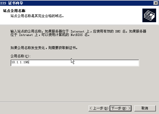 填写公用名称,由于在本环境中没有使用DNS服务器,没有域名因此使用IP地址访问,在公用名称中输入本机的IP地址,如果名称错误,后面过程中会出现问题,因此应仔细核对: