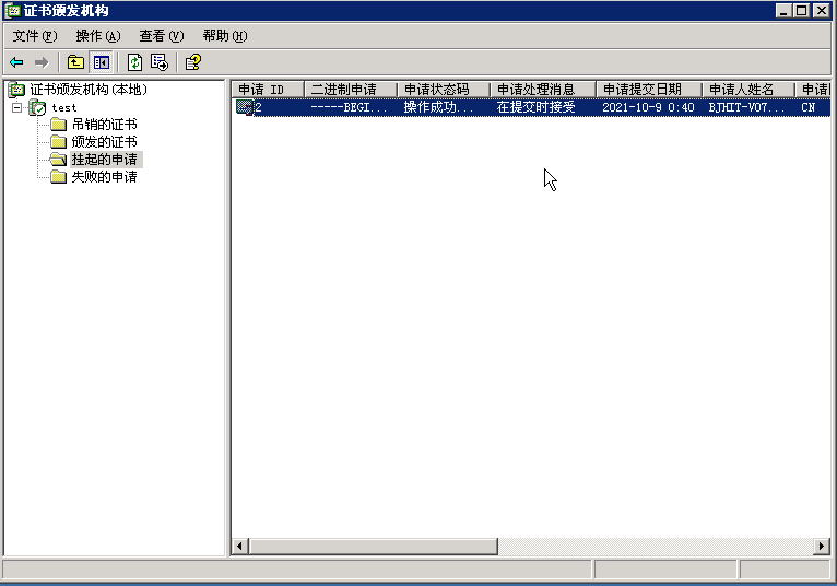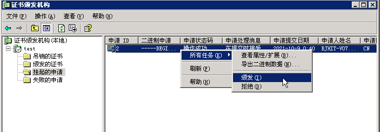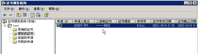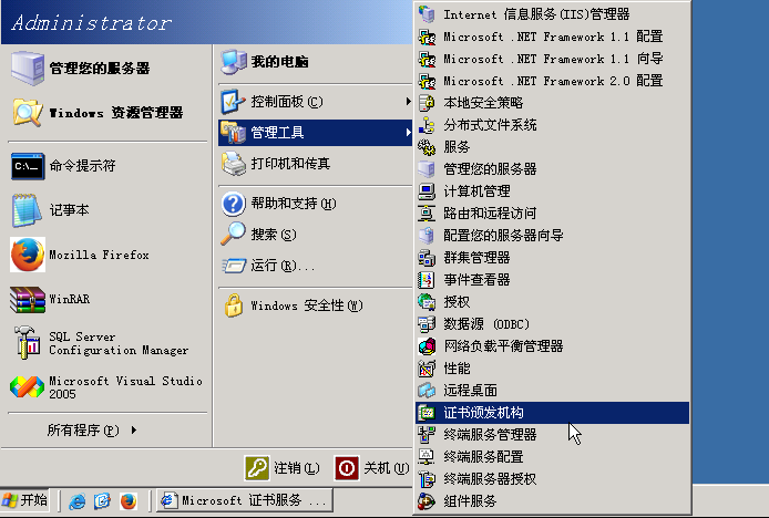 证书的颁发在证书服务器中操作,接下来的操作是证书审核员的角色,切换到CA服务器,点击“开始”>>“管理工具”>>“证书颁发机构”: