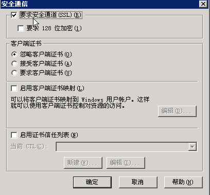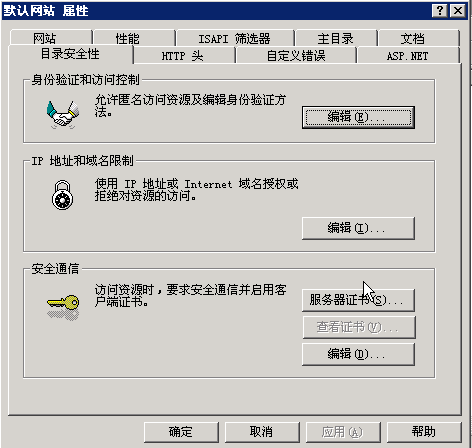 再进入到默认网站属性,选择“目录安全性”,单击“服务器证书”: