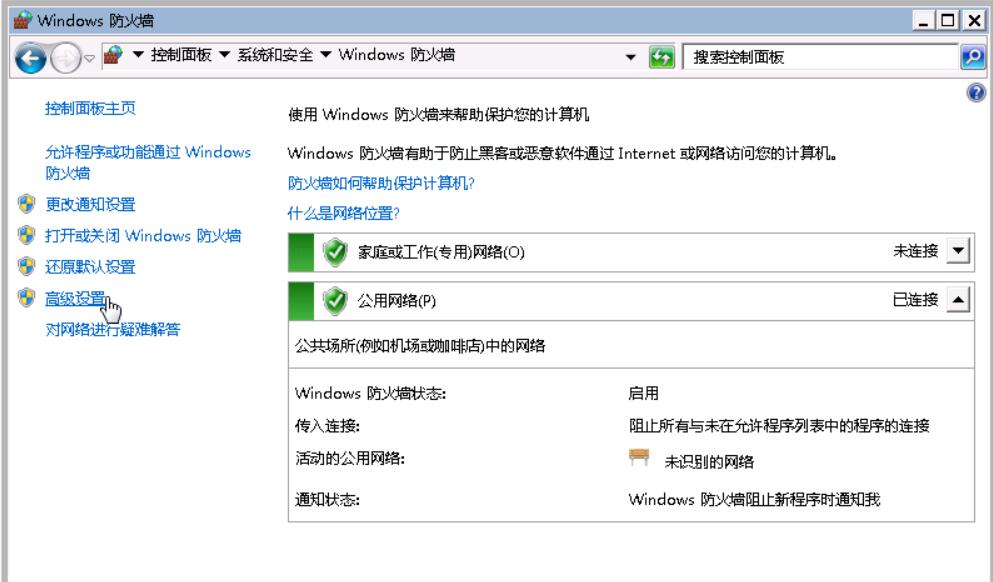 点击“高级设置”,出现“高级安全Windows防火墙”设置页面:
