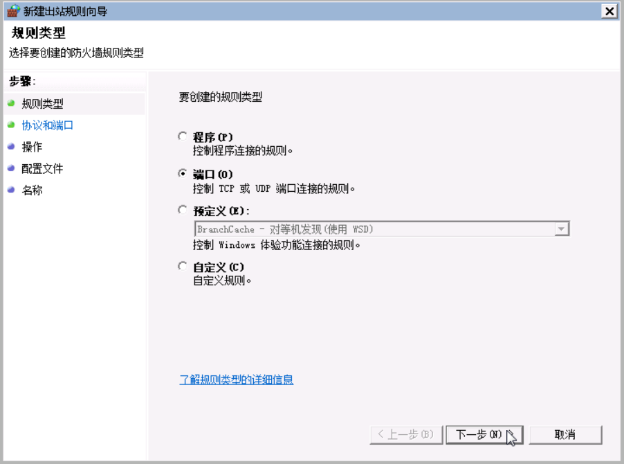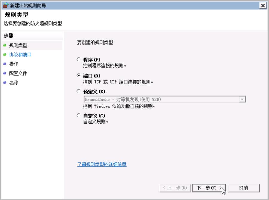 ②首先是“规则类型”配置,选择“端口”,并点击“下一步”。如下图: