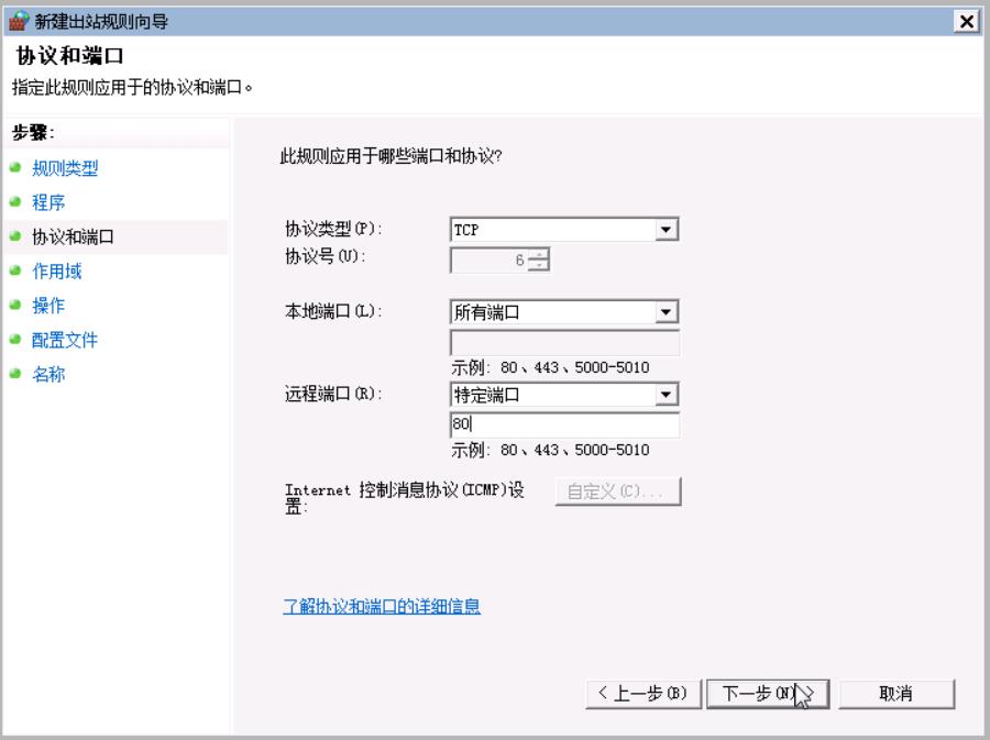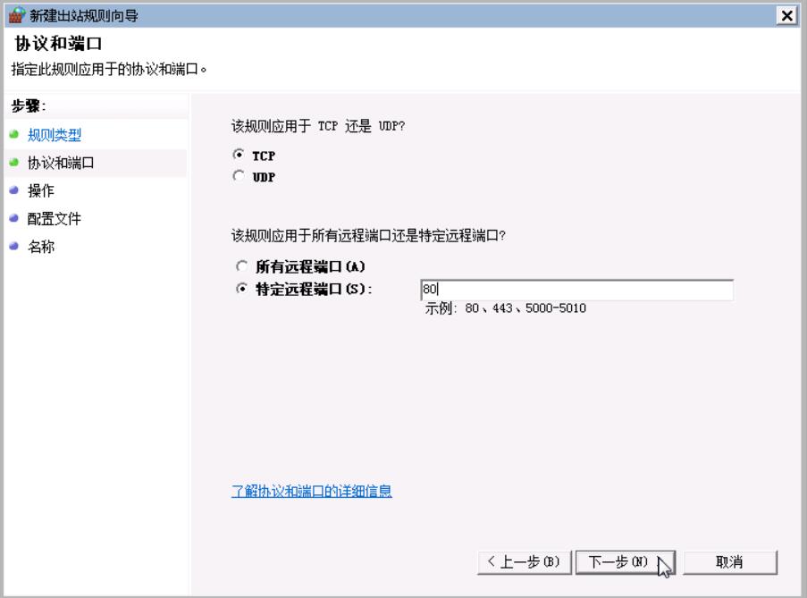 ③在“协议和端口”配置界面,选择“TCP”,选择“特定远程端口”,输入“80”,点“下一步”。见下图: