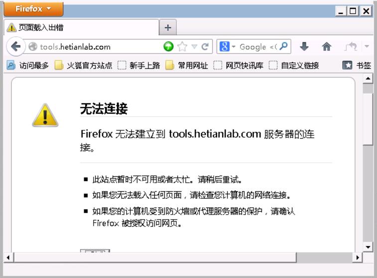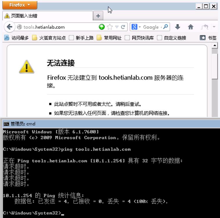 7、测试: 打开浏览器,此时已经无法访问http://tools.hetianlab.com。但可ping通。截图中返回了IP地址说明是通的,请求超时只是网站为了安全而设置的禁ping策略。