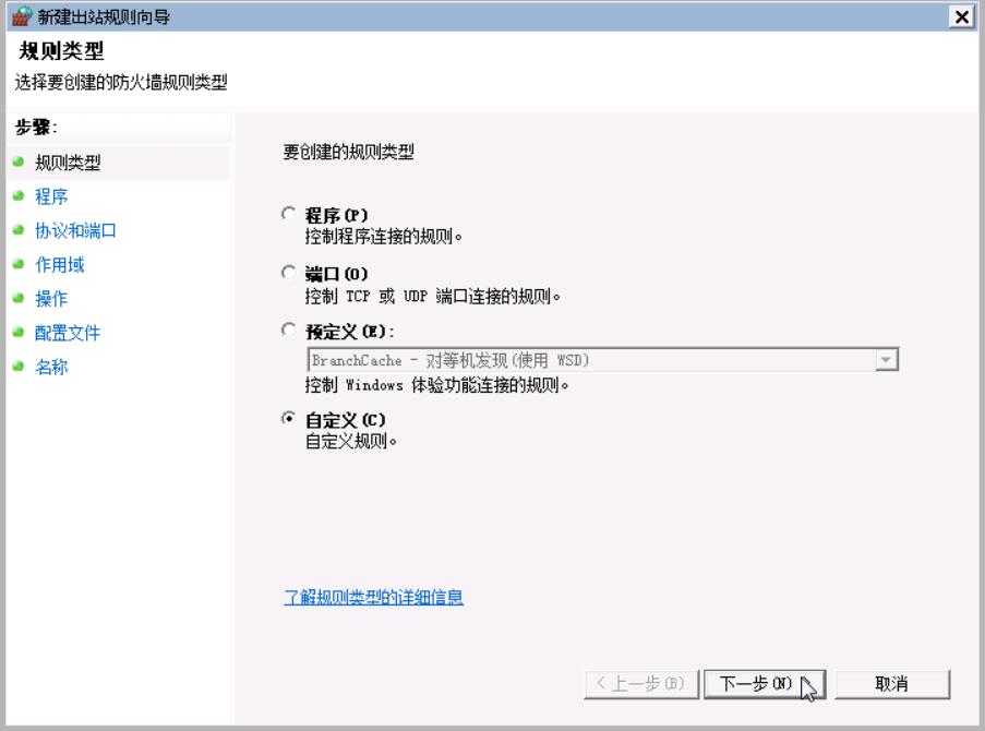 1、新建规则(出站规则),规则类型选“自定义”,点“下一步”。
