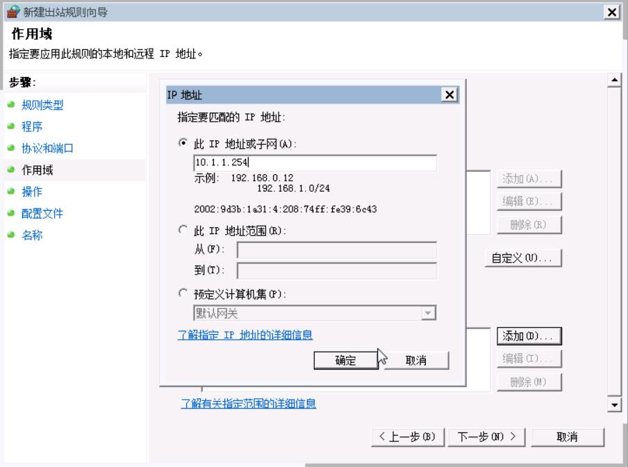 4、在“作用域”界面,点击“添加”,将弹出“IP地址”对话框,输入网址的IP地址,获取IP的方法为CMD 里ping tools.hetianlab.com,点击“确定”,回到“作用域”后,点击“下一步”。见下图: