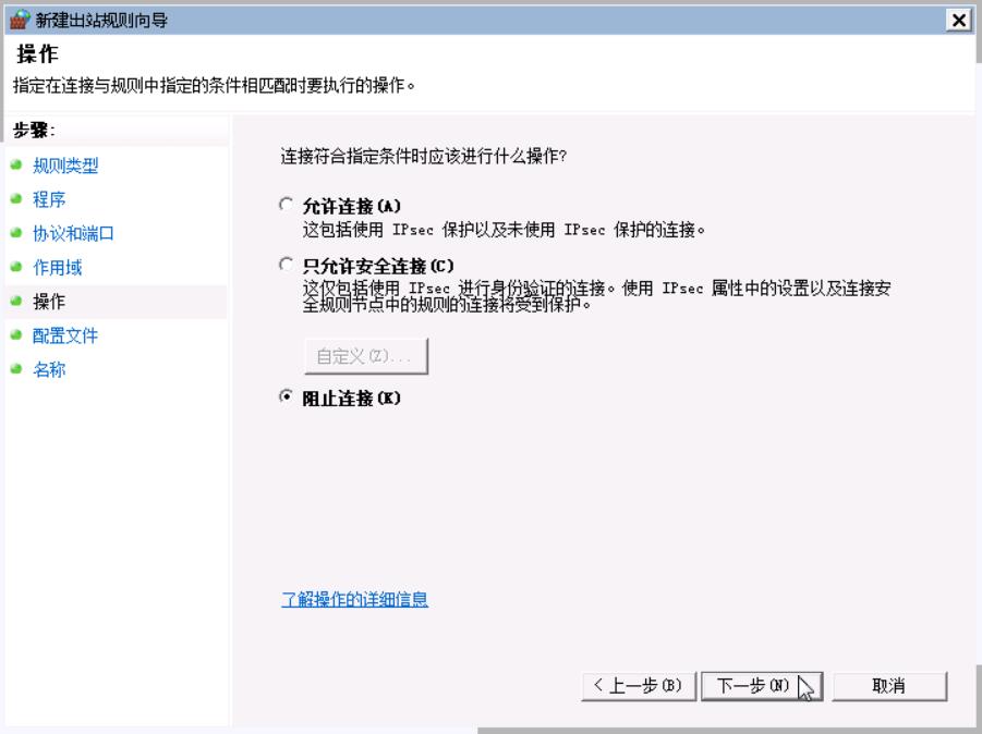 2)设置出口规则为“阻止对80端口的TCP连接”(即禁止访问Web服务器)。