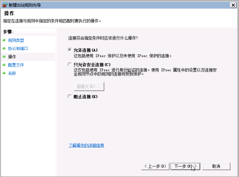 ④在“操作”界面,选择“允许连接”,点“下一步”。
