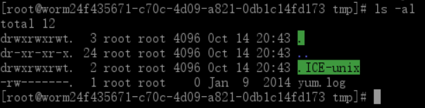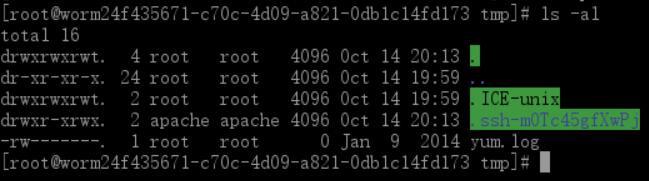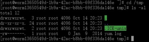 2、经过一段时间之后(大约10分钟),登录Worm2。同样使用命令:”ls -al /tmp”查看,可以发现主机也被此蠕虫感染。对比效果如下图: