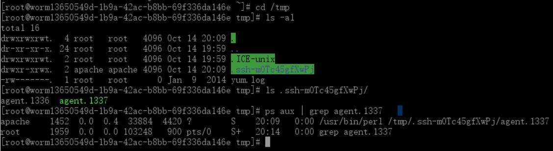 通过对比/tmp目录可以发现,Worm1已经被感染了shockworm蠕虫程序。