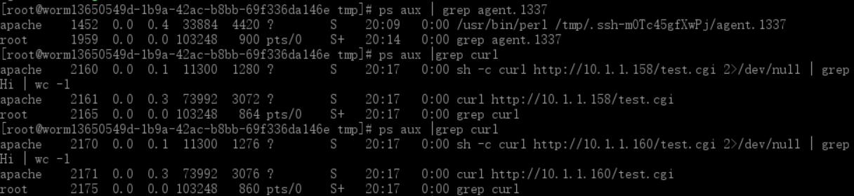 1、登录Worm1(10.1.1.12),不断的执行命令:“ps aux |grep curl”可以看到蠕虫的传播过程,被感染的Worm1通过agent.1337进程,不断的向同网段的其他主机发起攻击与感染。如下所示: