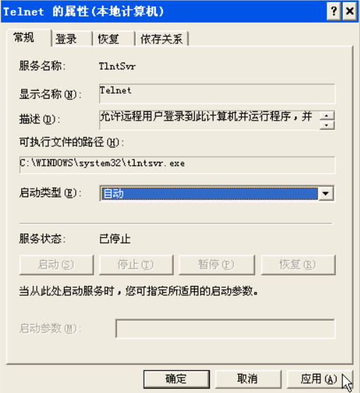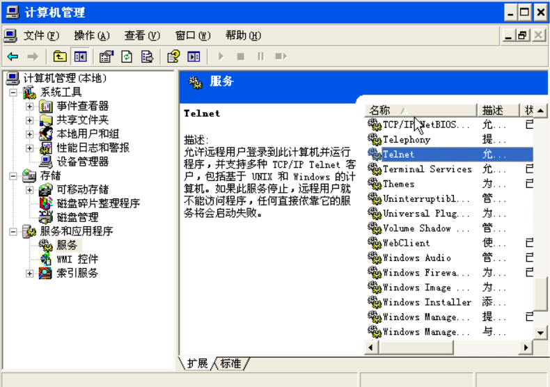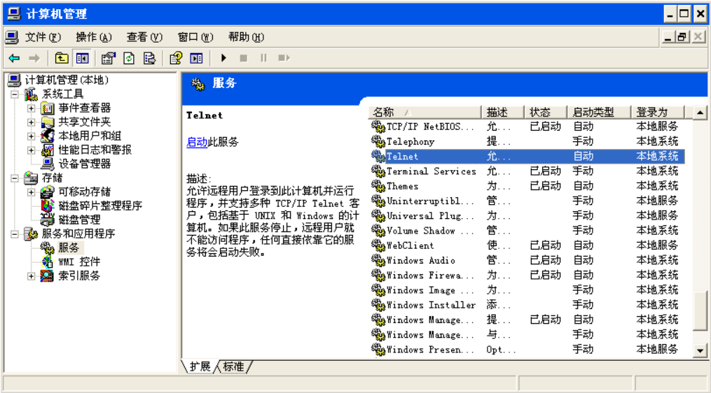 进入主机A,右键“我的电脑”->管理->服务和应用程序->服务,找到Telnet服务,如图所示: