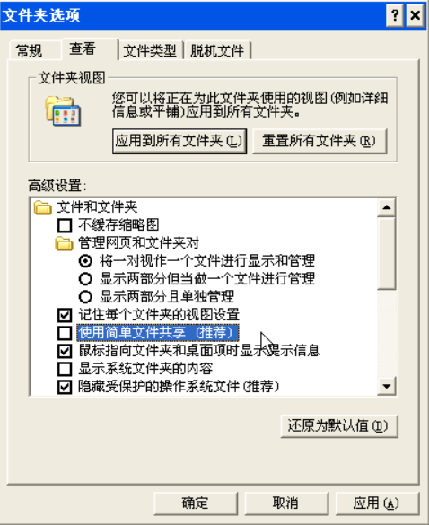 2、在主机B的“控制面板-工具-文件夹选项-查看-简单的文件共享”去掉选取。