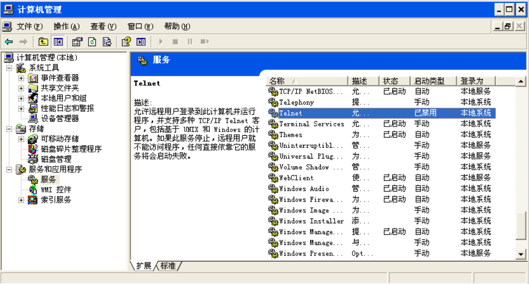 3、右键“我的电脑”->管理->服务和应用程序->服务,找到Telnet服务,关闭之: