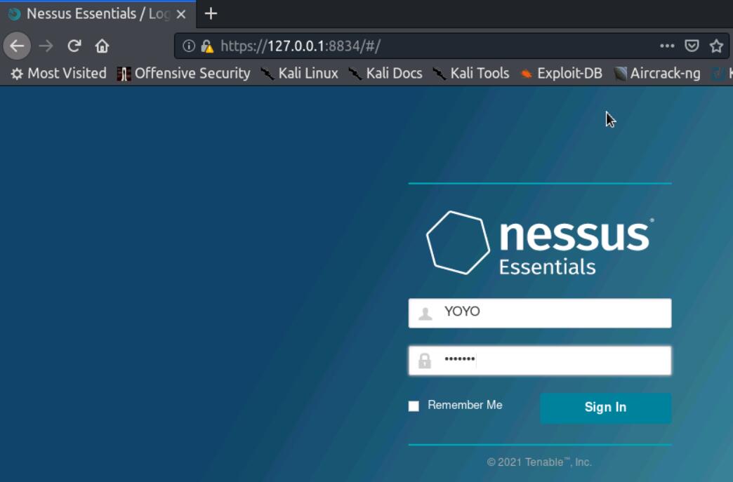 访问Nessus控制端https://127.0.0.1:8834/。输入安装时设置的账号信息(密码在桌面nessus文件夹内)。