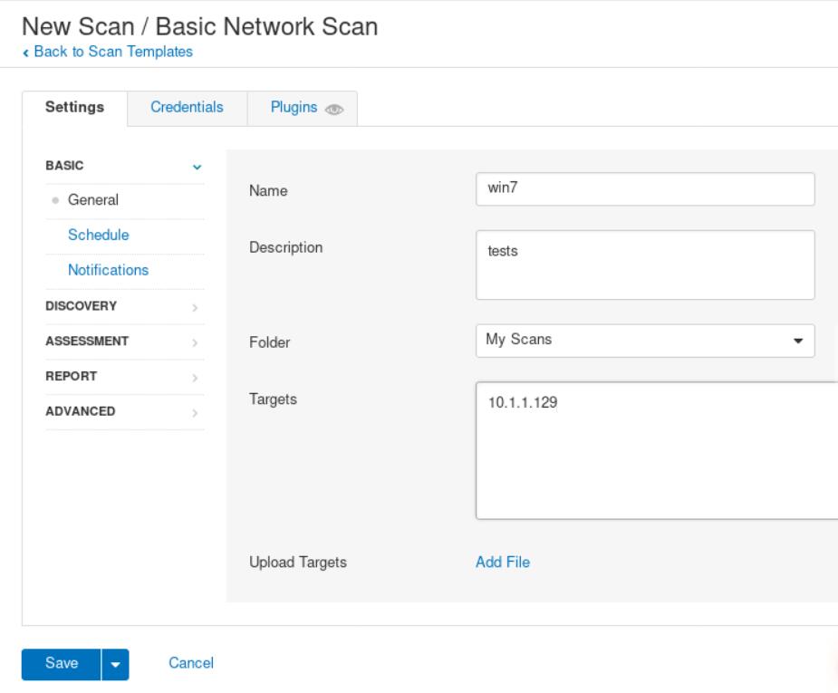 配置扫描信息,主要设置扫描名称、描述和扫描目标三个信息即可,其他配置选择默认,配置完成点击Save。选择对10.1.1.129网段进行扫描,如下图所示。