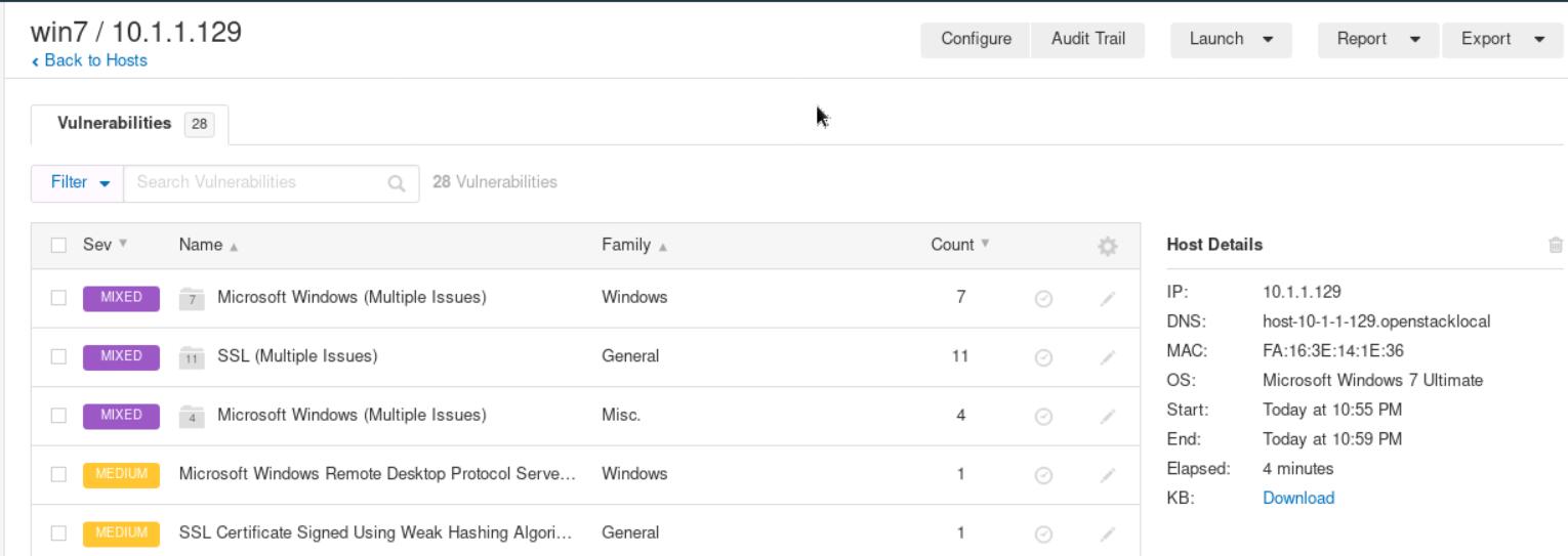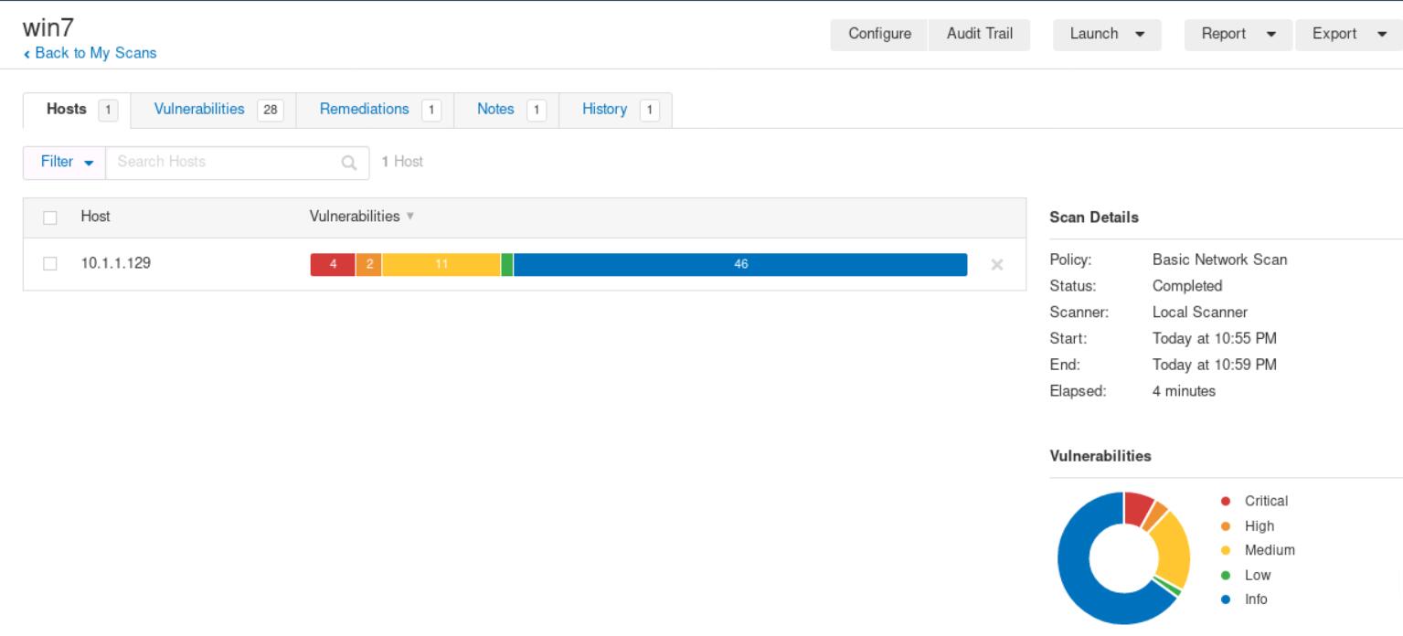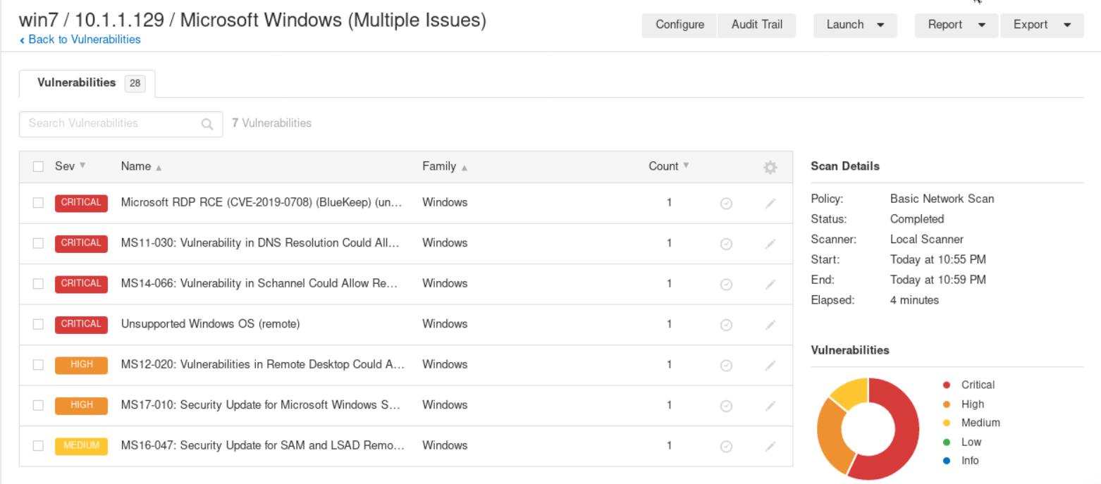重点关注10.1.1.129主机,即win7靶机,Nessus扫描出该主机存在四个最高危漏洞、2个高危漏洞及其它漏洞问题。