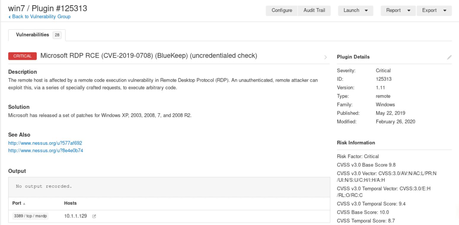 选中高危漏洞,Nessus给出了该漏洞的介绍、风险信息、解决方案等详细信息。Risk information对于攻击者来说非常有用,可以根据Risk information去Google搜索是否存在已知的漏洞利用Exp。