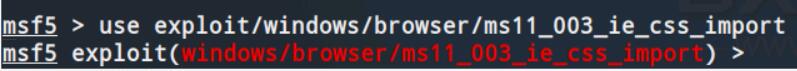 2、运行命令:“use exploit/windows/browser/ms11_003_ie_css_import”选择漏洞利用EXP