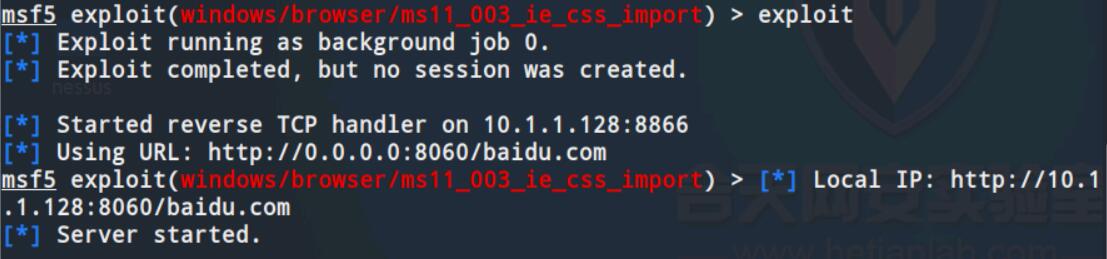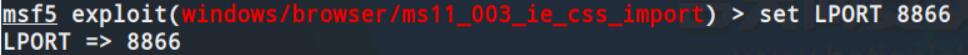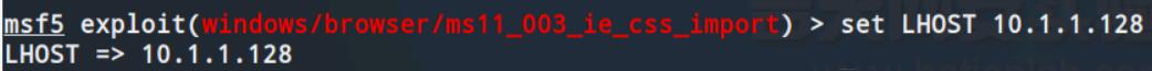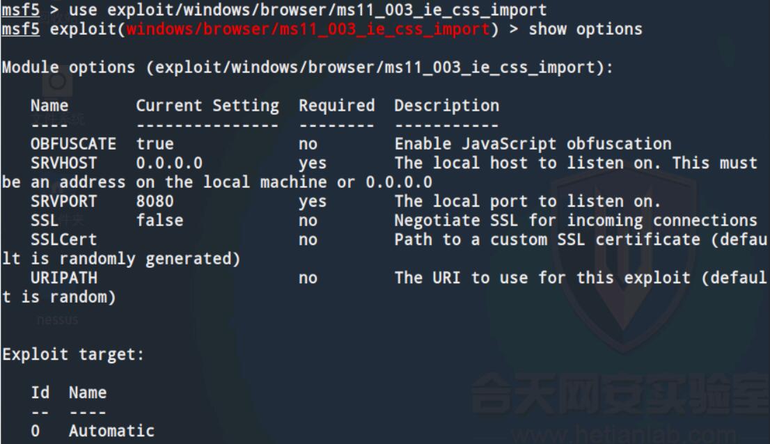 步骤二中扫描得到win7主机系统存在MS11_030解析漏洞,但是该漏洞利用条件较为苛刻,因此选择MS11_003 IE CSS Import漏洞来演示如何通过诱骗攻击者点击我们精心构造的含有攻击代码的网页来实现系统入侵。