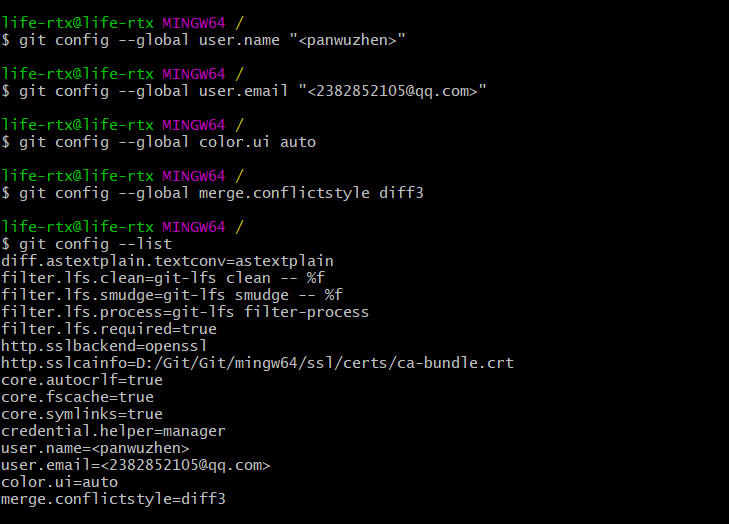 在开始使用 Git 之前,要进行初始配置 ,如下设置用户名和邮箱等基础配置。
