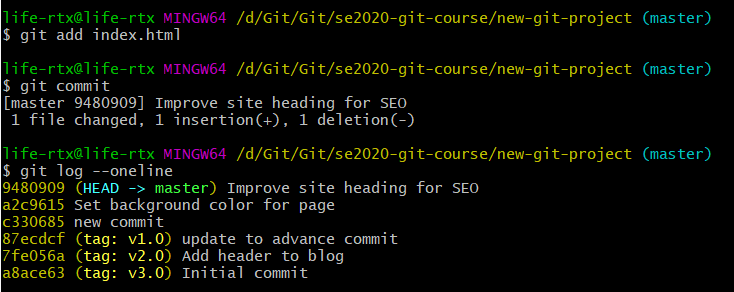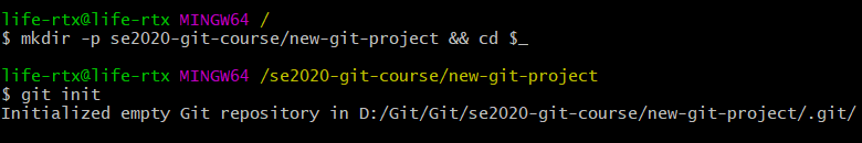 在对 Git 仓库进行 commit 或执行任何其他操作之前,需要一个实际存在的仓库,首先创建一个目录,叫做 se2020-git-course,在该目录中,创建另一个目录,叫做 new-git-project,使用 cd 命令移到 new-git-project 目录下,然后使用 git init命令,新建一个仓库。