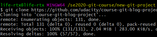 克隆实验所需仓库,输入命令 git clone,然后输入克隆的 Git 仓库的路径,实验使用以下 URL :https://github.com/udacity/course-git-blog-project 。