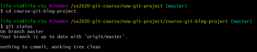 - Your branch is up-to-date with 'origin/master'. – 因为我们使用 git clone 从另一台计算机上复制了此仓库,因此这部分告诉我们项目是否与所复制的仓库保持同步状态。我们不会在其他计算机上处理该项目,因此这一行可以忽略。