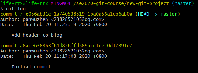 使用 git log 检查刚刚提交的 commit ,运行结果如下图: