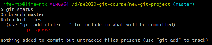 Word 文档已不再列为未跟踪文件(untracked files )。但是列出了新的".gitignore"文件。git 知道查看名称为 .gitignore 的文件的内容。因为它在其中看到"project.docx",所以忽略了该文件,并且没有在 git status 的输出结果中显示该文件。