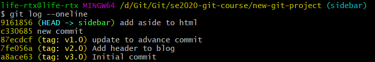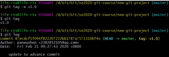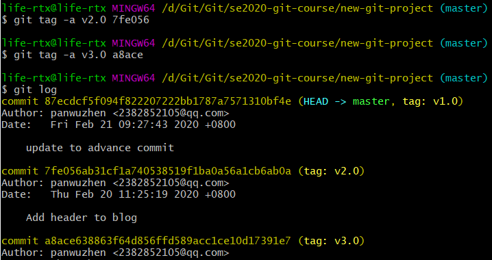 不使用 -a 选项只会添加一个轻量级标签,使用 git tag + SHA 可以为指定 commit 添加标签信息,运行结果如下: