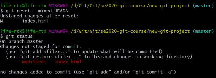 - 使用 --mixed 选项取消暂存已被 commit 的更改