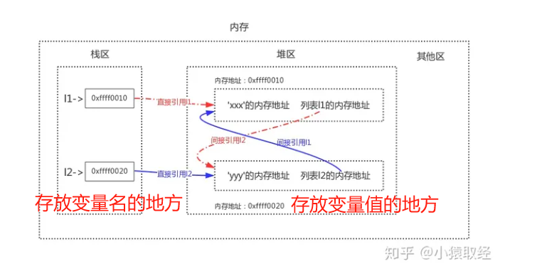 - 间接引用,比如列表,对于列表l而言,他的直接引用地址是后面的列表。