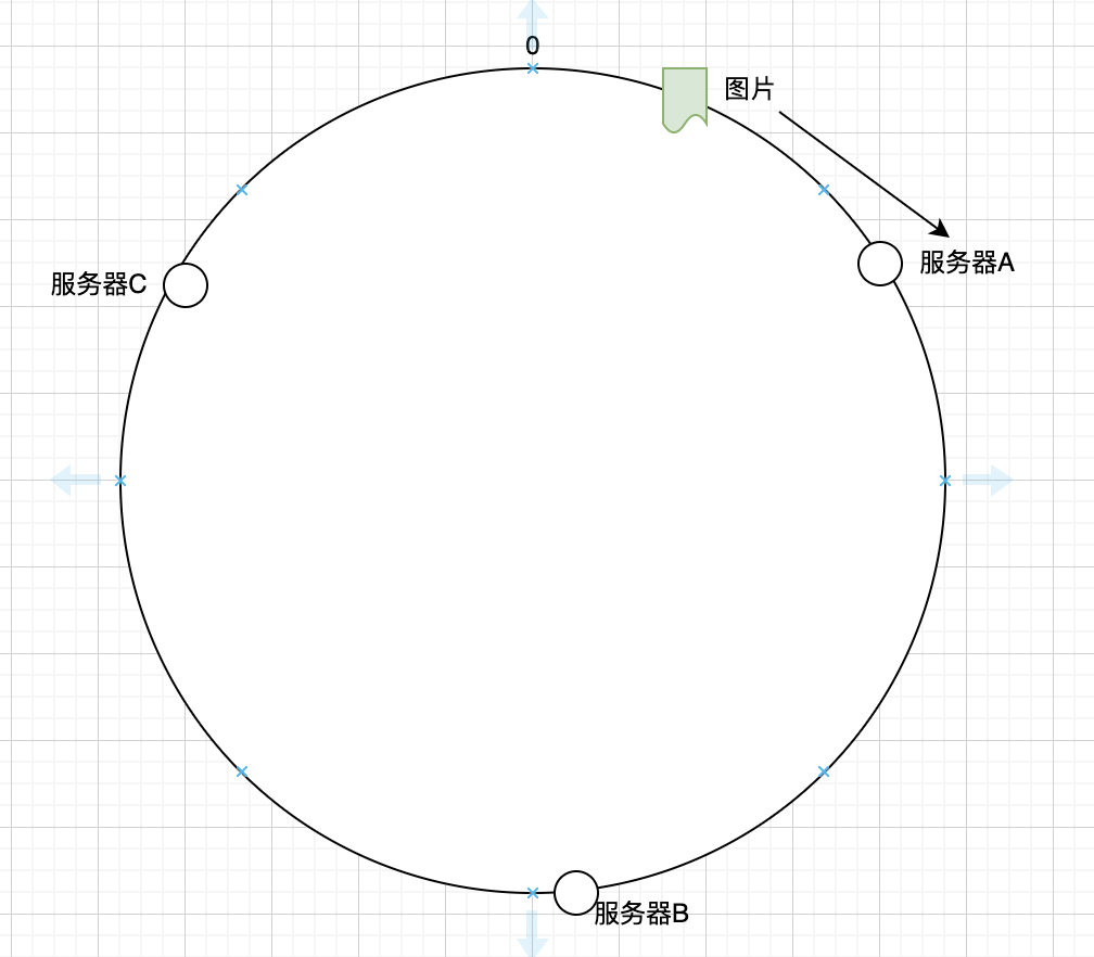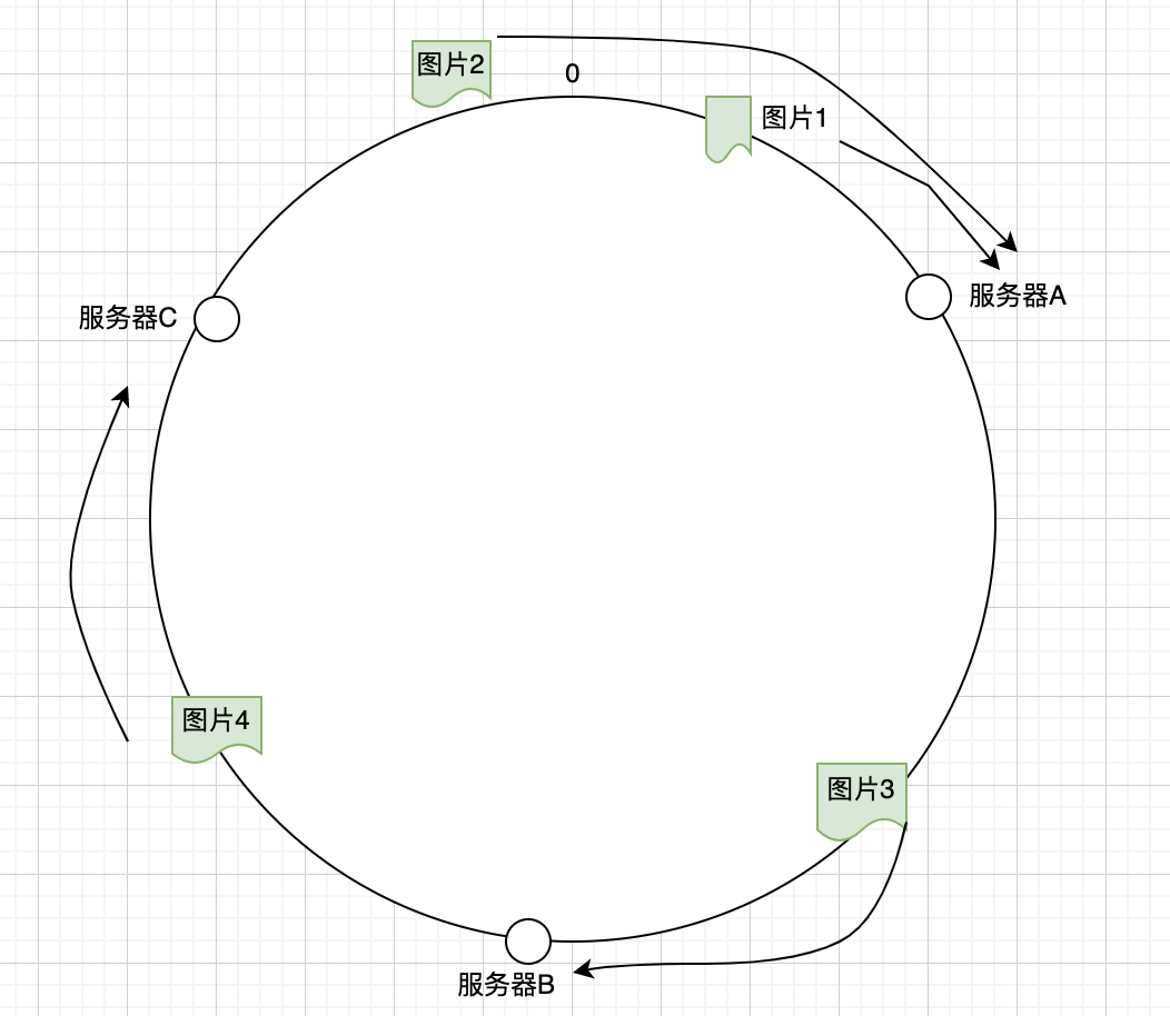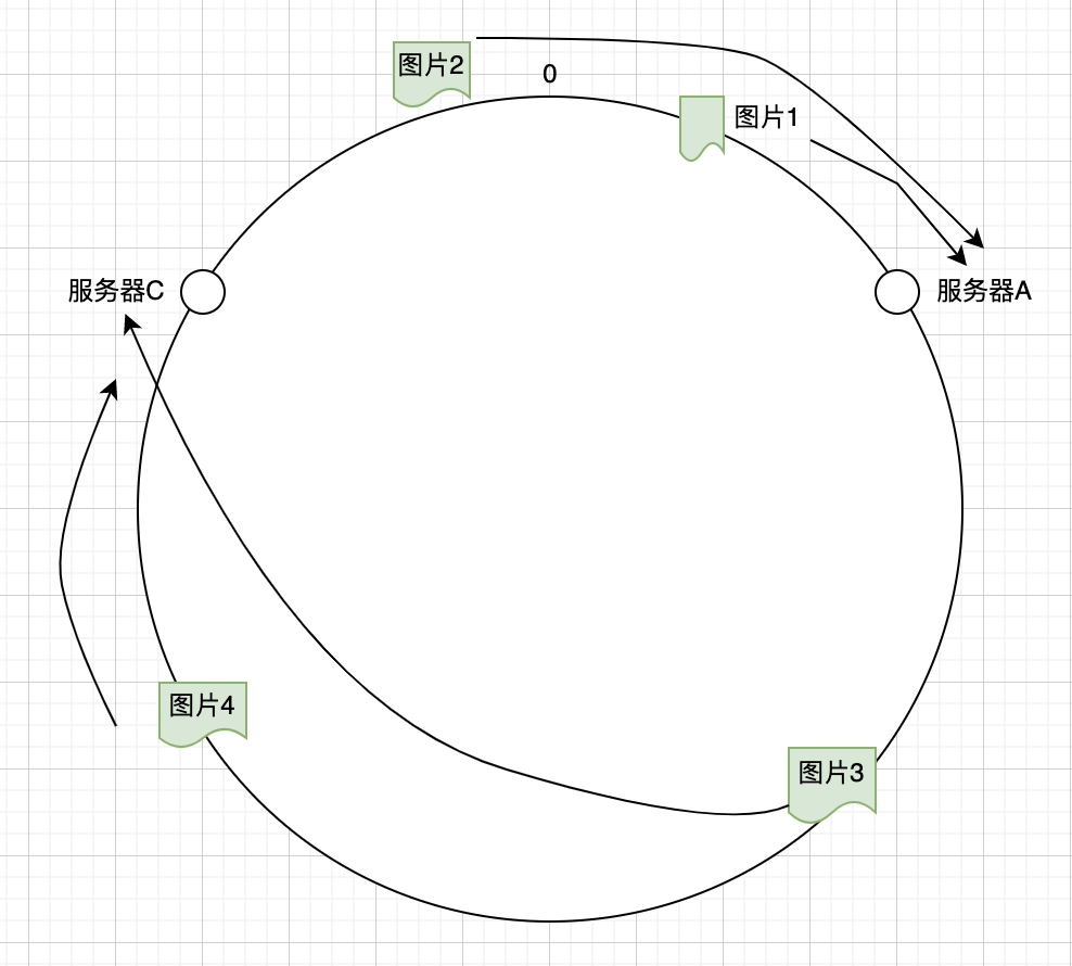 那么它是如何决定到哪台服务器上去呢,上面的图片会被缓存到服务器A上,为什么会这样呢?因为从图片的位置开始,沿顺时针方向遇到的第一个服务器就是服务器A,所以上图会被缓存到服务器A上,如下图所示