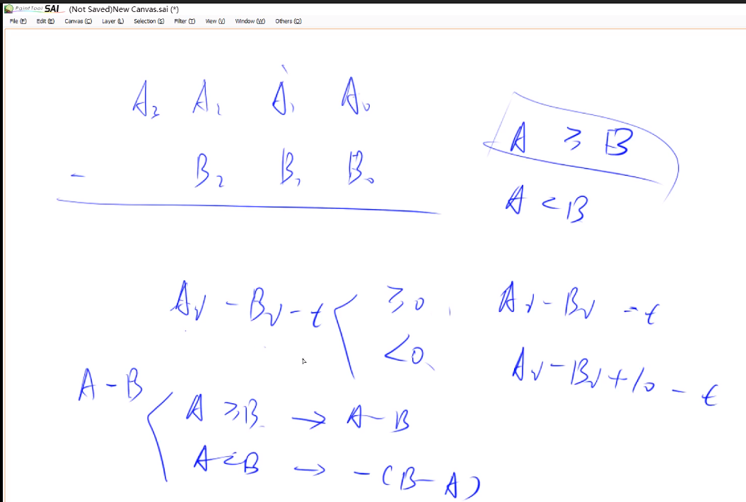 思想上差不多,但是借位方面较为麻烦,另外需要考虑两个数相减的为”大数“-”小数“来得到绝对值,而结果的正负另外判断: