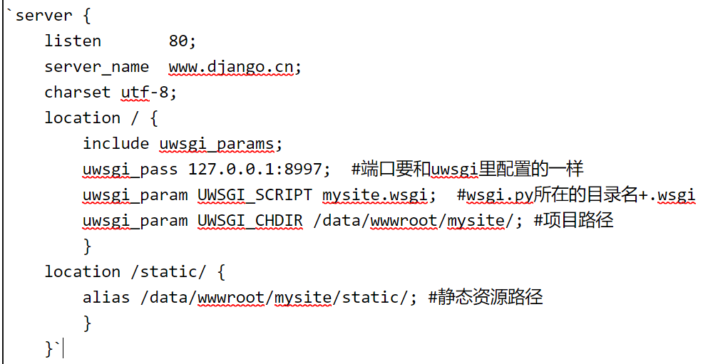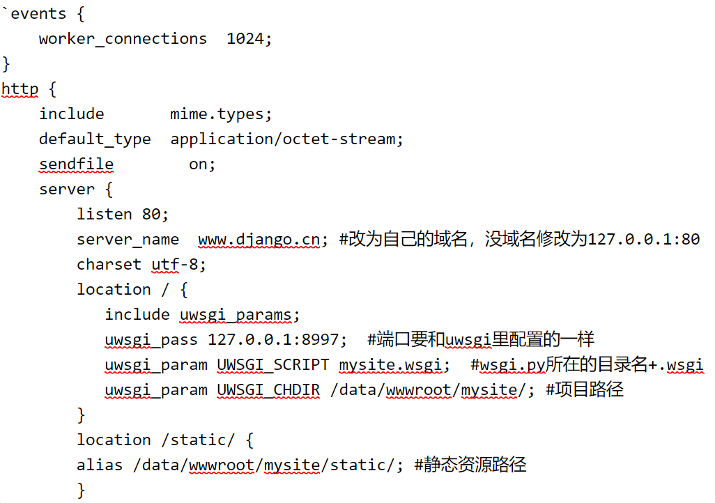 server { listen 80; server_name www.django.cn; charset utf-8; location / { include uwsgi_params; uwsgi_pass 127.0.0.1:8997; #端口要和uwsgi里配置的一样 uwsgi_param UWSGI_SCRIPT mysite.wsgi; #wsgi.py所在的目录名+.wsgi uwsgi_param UWSGI_CHDIR /data/wwwroot/mysite/; #项目路径 } location /static/ { alias /data/wwwroot/mysite/static/; #静态资源路径 } }