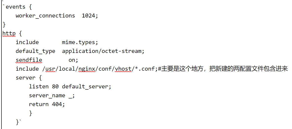 events { worker_connections 1024; } http { include mime.types; default_type application/octet-stream; sendfile on; include /usr/local/nginx/conf/vhost/*.conf;#主要是这个地方,把新建的两配置文件包含进来 server { listen 80 default_server; server_name _; return 404; } }