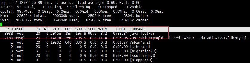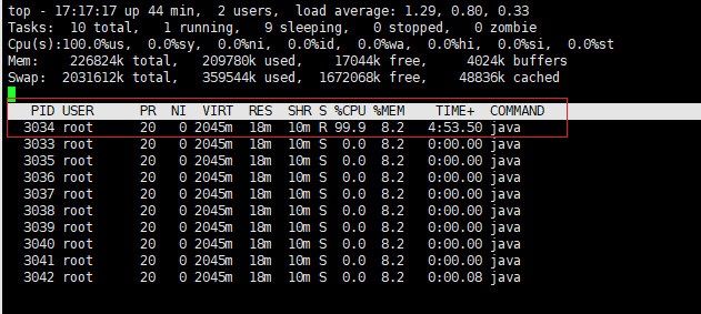 top -Hp 3033,显示一个进程的线程运行信息列表。按下P,进程按照cpu使用率排序
