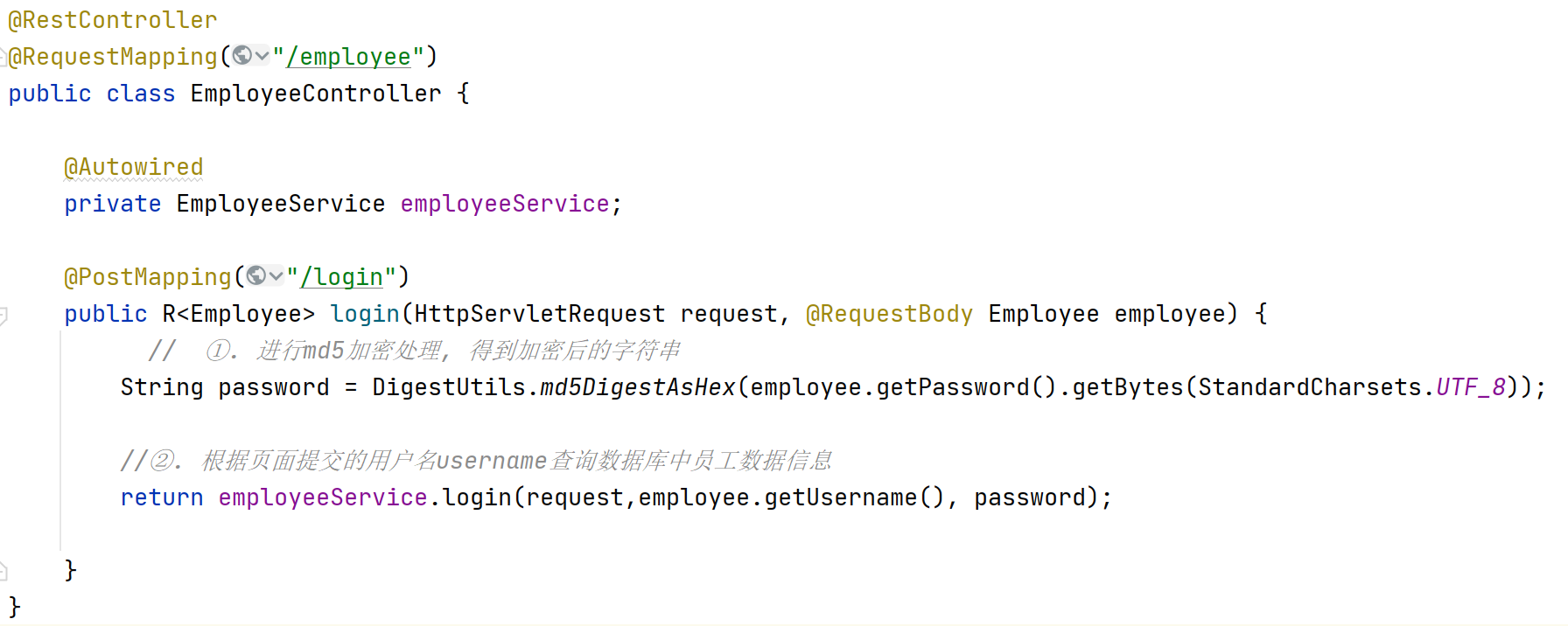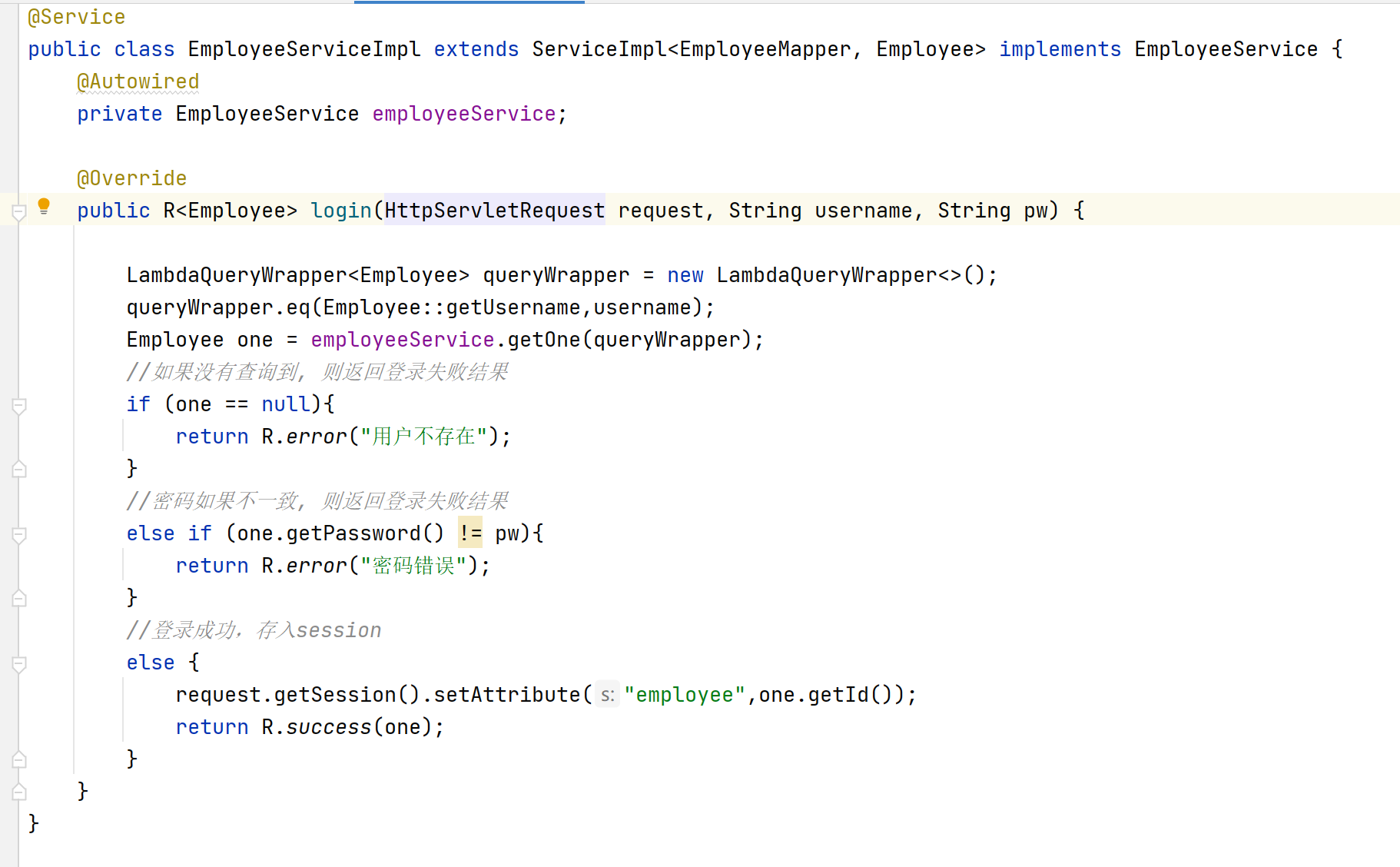 在这里需要注意的是为了提高安全性,可以将页面提交的password使用md5加密处理(保存用户的时候将用户的密码也要使用md5加密),查询时可以先查询用户名是否存在,如果不存在直接返回用户不存在。如果存在再判断密码是否正确。 登陆成功后将用户id存到session中并返回登录成功结果。